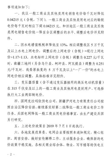 近日,自治區(qū)再次發(fā)文降低新疆一般工商業(yè)及其他類用電價(jià)格,此次電價(jià)調(diào)整政策從7月1日起執(zhí)行。