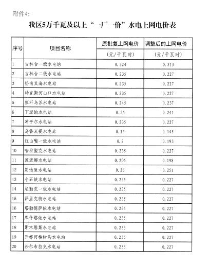 《通知》規(guī)定,因水電增值稅稅率降低至13%,相應(yīng)調(diào)整新疆5萬(wàn)千瓦及以上水電上網(wǎng)電價(jià)。水電標(biāo)桿上網(wǎng)電價(jià)(含稅)調(diào)整為0.227元/千瓦時(shí),南疆三地州(另含烏什縣、柯坪縣、阿瓦提縣)調(diào)整為0.251元/千瓦時(shí)。同時(shí),自治區(qū)發(fā)展改革委原批復(fù)的5萬(wàn)千瓦及以上“一廠一價(jià)”的水電上網(wǎng)電價(jià)相應(yīng)進(jìn)行調(diào)整。